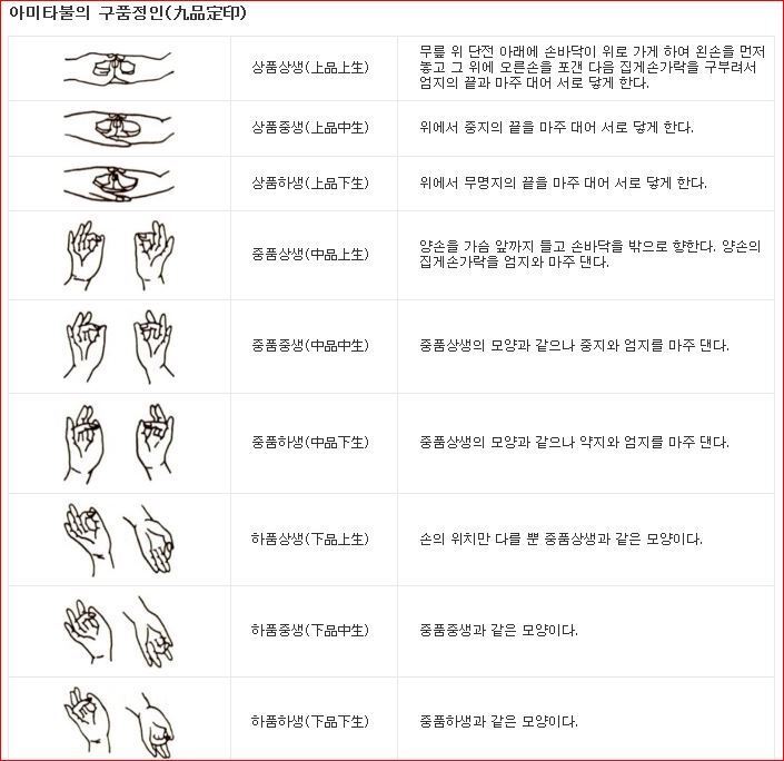 그리고 미타정인에는 9품(品)이 있어 이를 아마타여래 9품인이라고 한다. 즉, 극락세계에 왕생하는 무리를 상·중·하 3품으로 나누고 이를 각기 또 3생으로 나누어 9단계의 수인으로 나타낸다.